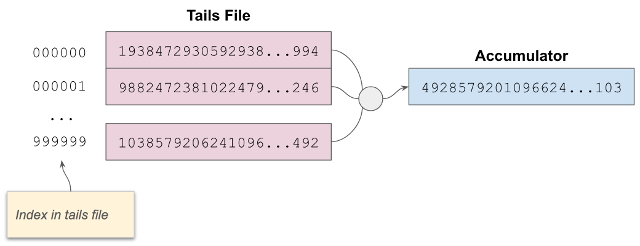 tails file은 누산기 및 해당 요소와 연관됩니다. 누산기에 대해 임의로 생성된 요소의 배열을 포함하는 이진 파일입니다. 2, 3, 7과 같은 작은 숫자 대신 이러한 요소는 화면에 편리하게 표시하기에는 너무 큰 숫자입니다. 일반적으로 tails file에서 이러한 숫자 요소의 수량은 수십만에서 수천만에 이릅니다.