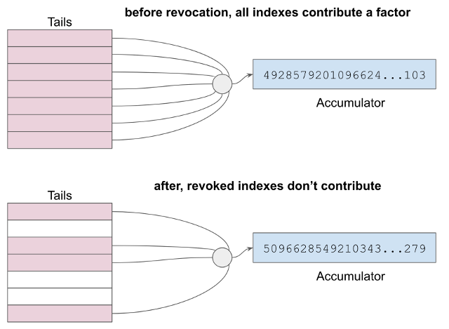 특정 발행자가 발핸항 각 잠재적 또는 실제의 credential에는 tails file의 누적 요소에 대한 색인이 지정됩니다. 그러나 해지되지 않은 credential만 누산기의 값에 기여합니다. 우리는 이것이 어떻게 작동하는지 볼 것입니다.