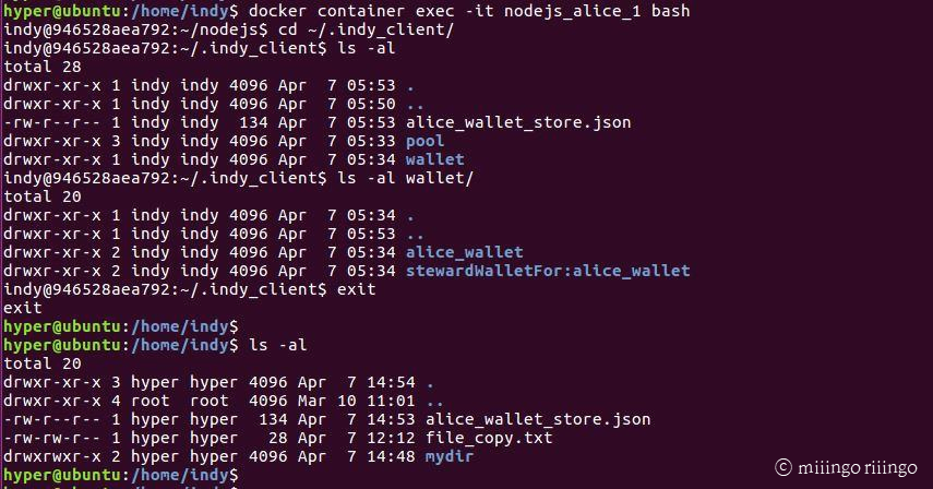 예를 들어, nodejs_alice_1 컨테이너 내에 있는 ~/.indy_client/alice_wallet_store.json 파일을 호스트의 /home/indy/alice_wallet_store.json에 복사할 경우 다음과 같은 명령을 실행하면 된다.