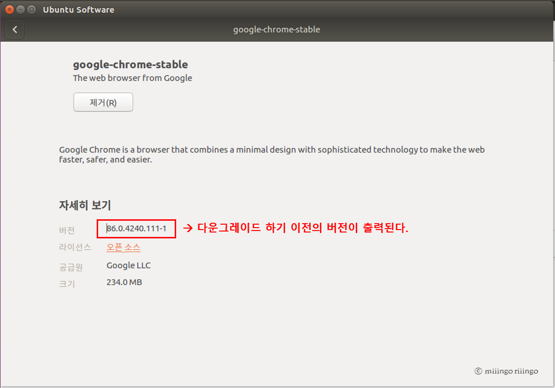 Ubuntu Software에서 확인하면 다운그레이드 하기 이전의 버전으로 출력이 되는데, 크롬(Chrome)에 접속(chrome://settings/help)해 설정에서 Chrome 정보를 확인해보면 내가 원하는 버전으로 설치된 것을 확인할 수 있다.